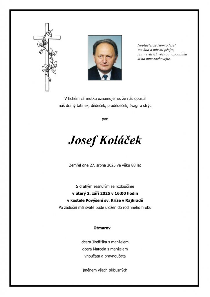A lítostí oznamujeme, že nás opustil bývalý dlouholetý starosta Otmarova, pan Josef Koláček.