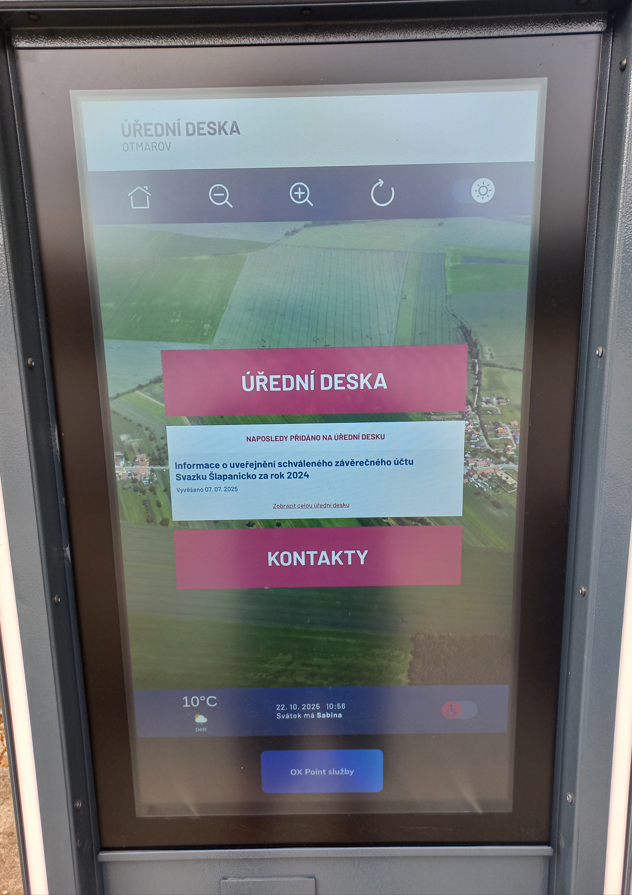 obecní úřad Otmarov má od dnešního dne v provozu eletronickou úřední desku, která je součástí doručovacího a podacího místa pro zásilky - OX Pointu (ikona Úřední deska nově v nabídce na dotykové obrazovce OX pointu) Tím je splněna podmínka, že úřední deska je veřejně přístupná plocha určená ke zveřejňování právních předpisů, rozhodnutí a jiných dokumentů správních orgánů a soudů. Veřejně přístupná musí být nepřetržitě a vedena je zásadně ve dvojí podobě zároveň, fyzické i elektronické, nebo také jejich kombinací a to, že deska bude sloužit ve veřejném prostoru jako dotyková obrazovka.