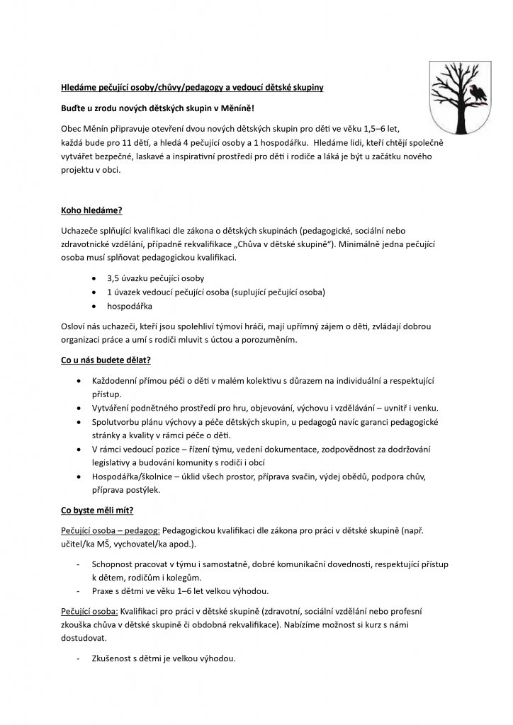 Inzerát na personální obsazení Dětských skupin Měnín