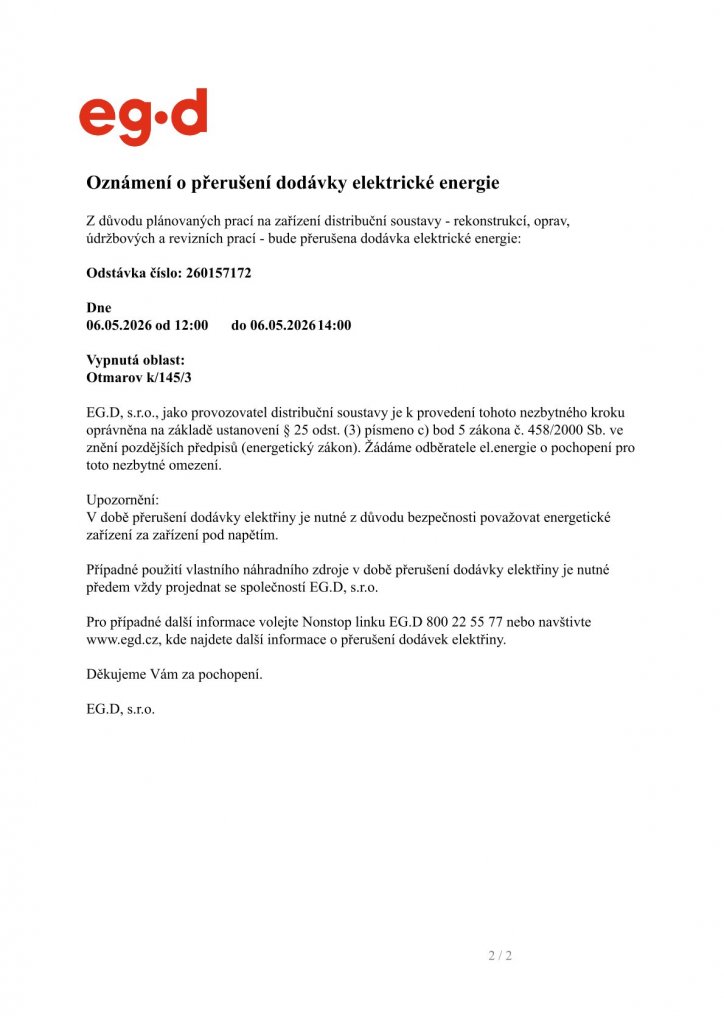Oznámení o přerušení dodávky elektrické energie - 6.5.2026